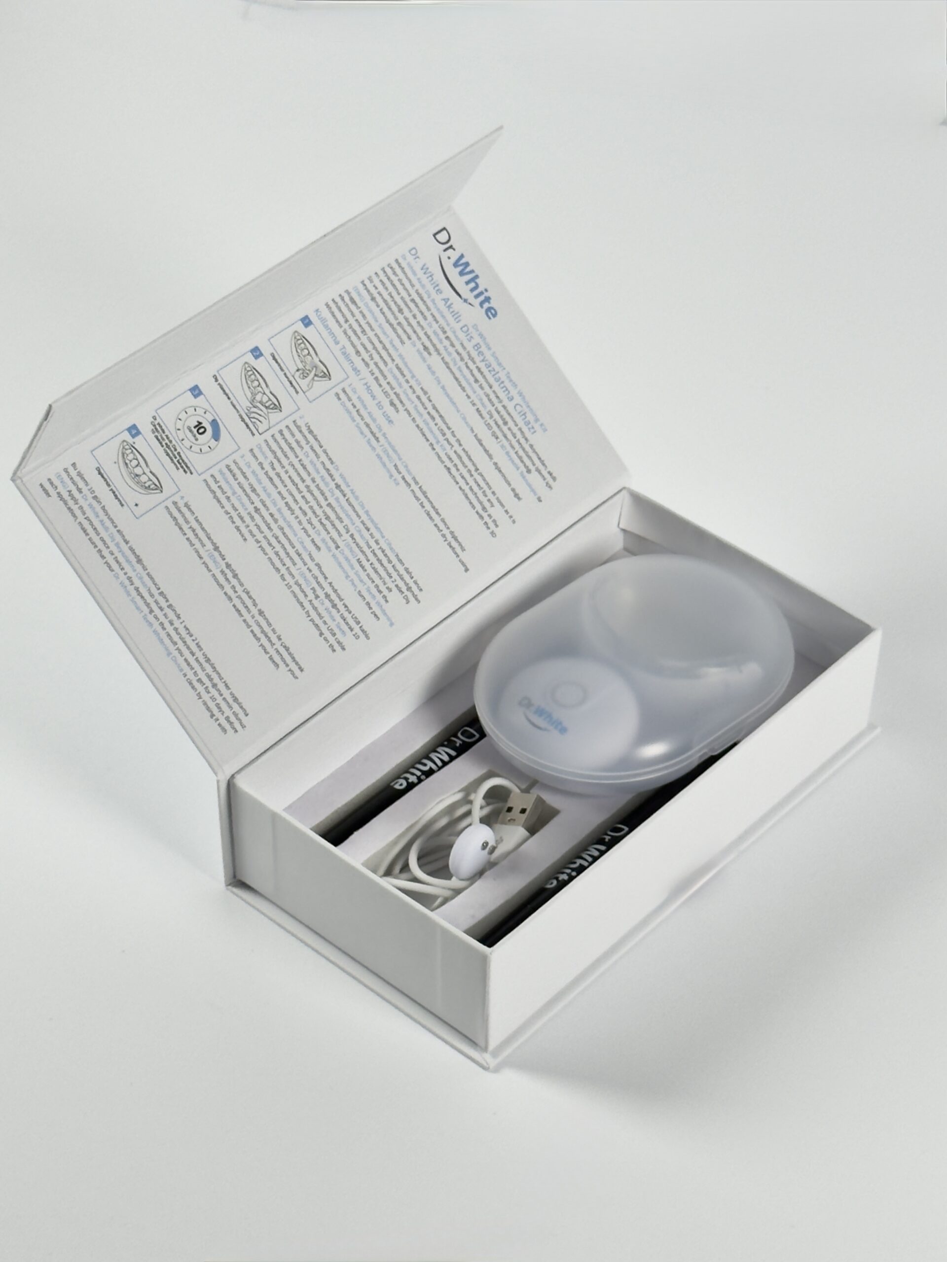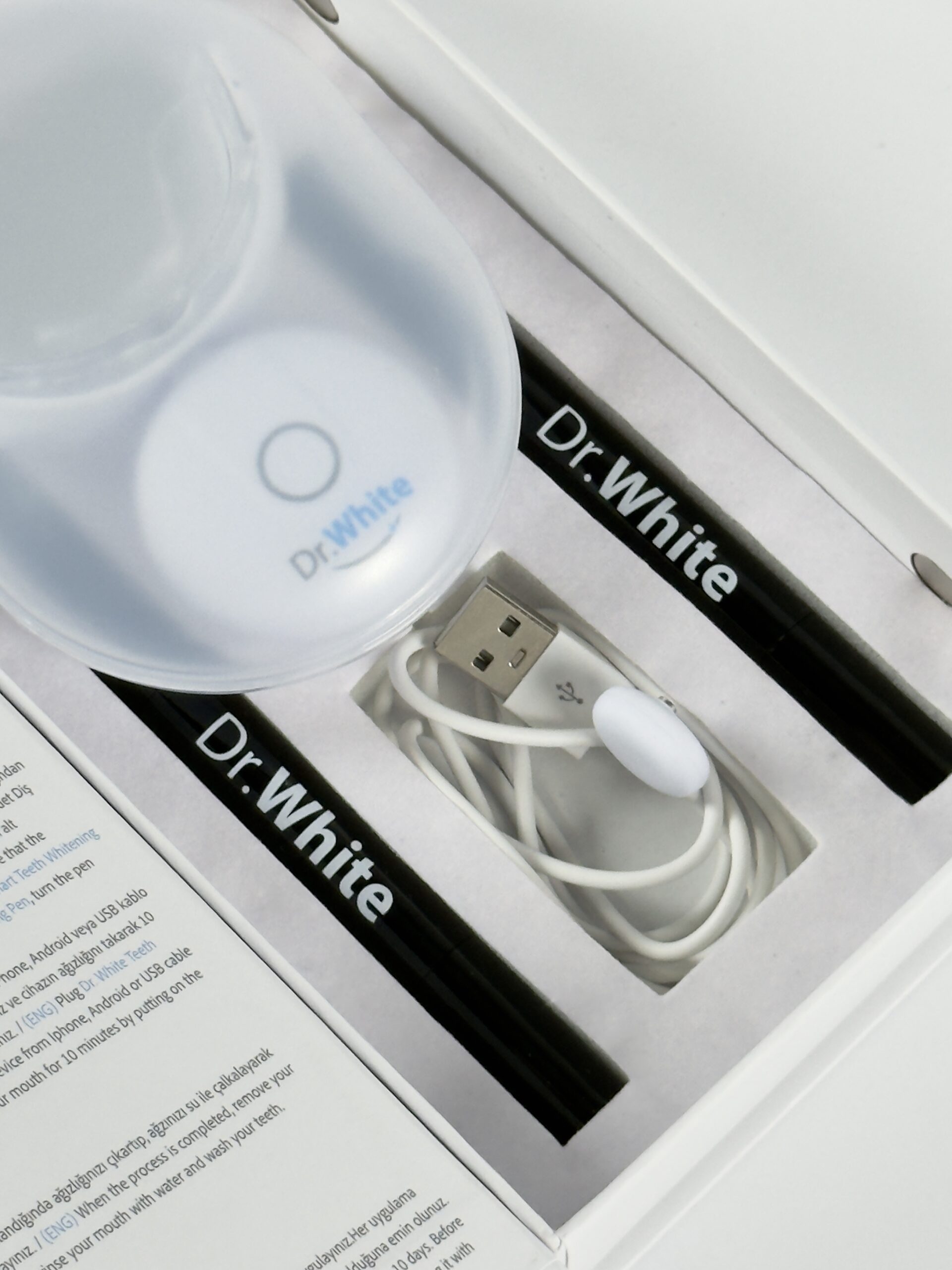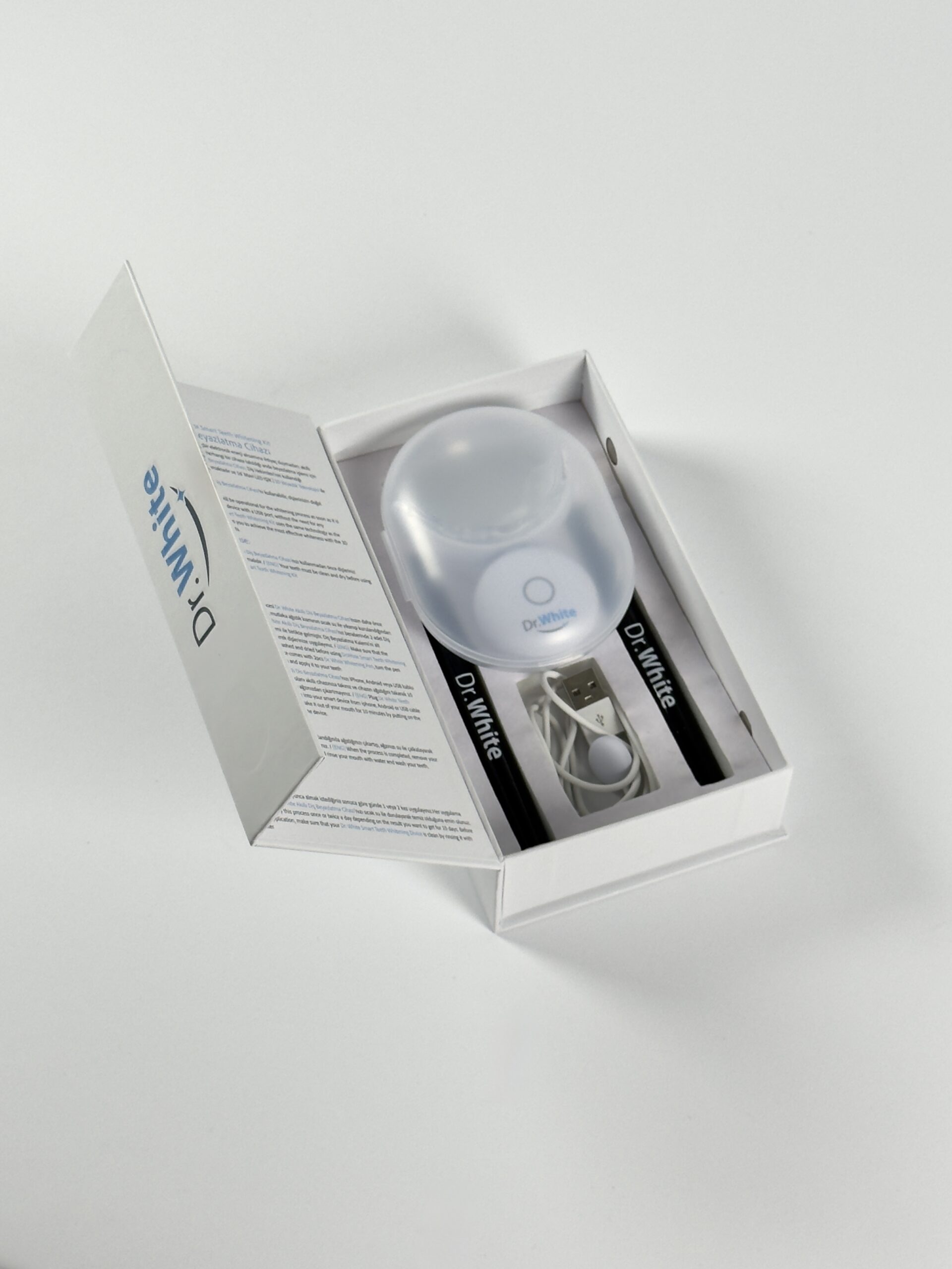 Две избелващи писалки и смарт LED устройство в кутия, с универсални USB кабели за различни телефони.