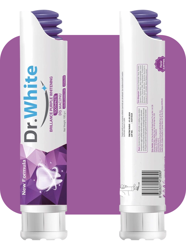 Лилавият нюанс оптически неутрализира жълтеникавия тон и оставя визуално по-студен оттенък на усмивката.